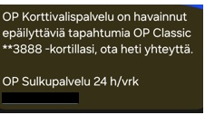 För närvarande sprider sig en bluff där en brottsling skickar textmeddelanden i OP:s och andra företags namn. I meddelandet bes mottagaren ringa servicenumret genast. Som orsak kan anges till exempel indrivningskrav eller konstiga kontotransaktioner.