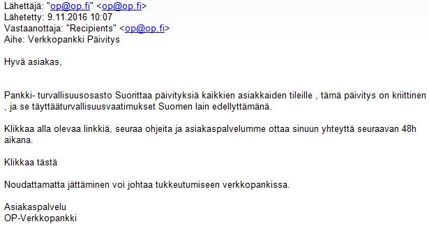 OPn nimissä on liikkeellä huijaussähköposteja, joiden avulla yritetään kalastella henkilötietoja ja verkkopankkitunnuksia. Huijaussähköpostissa kerrotaan kriittisestä päivityksestä, joka tulisi tehdä klikkaamalla sähköpostissa olevaa linkkiä. Jos olet antanut henkilökohtaisia tietojasi huijaussivustolla, huijari saattaa myös soittaa esiintyen esimerkiksi OPn turvallisuushenkilönä ja urkkia siten lisätietoja. Puhelut ovat saapuneet voivat saapua tuntemattomasta numerosta. OPn puhelinpalvelusta saapuvan soiton tunnistat numerosta 010 252 0500. Älä luovuta huijarille mitään tietoja!