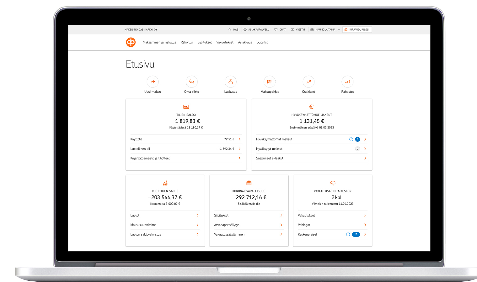 Näet etusivulta nyt myös rahoituksen, sijoittamisen ja vakuuttamisen palvelut.