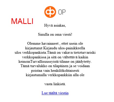 Kom ihåg att OP aldrig ber någon logga in i nättjänster via en länk i ett e-postmeddelande eller textmeddelande. OP ber aldrig heller att få dina personliga nättjänstkoder, kreditkortsuppgifter eller din personbeteckning per e-post eller textmeddelande. Om du får ett falskt meddelande, svara inte på meddelandet och klicka inte på någon länk i det.