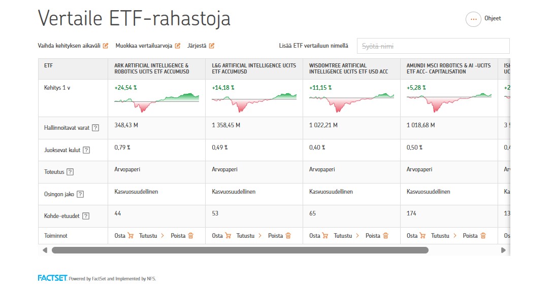 Joskus saattaa tuntua siltä, että satojen ETF:ien joukosta voi olla haastavaa löytää se itselleen sopivin vaihtoehto. Jatkossa uuden vertailutyökalun avulla voit etsiä esimerkiksi tietyn maa-alueen, megatrendin, toimialan tai vastuullisuusluokan ETF:iä. Kun olet löytänyt itseäsi kiinnostavan kategorian, voit vertailla saman kategorian ETF-rahastoja keskenään monien eri ominaisuuksien mukaan, kuten esimerkiksi: