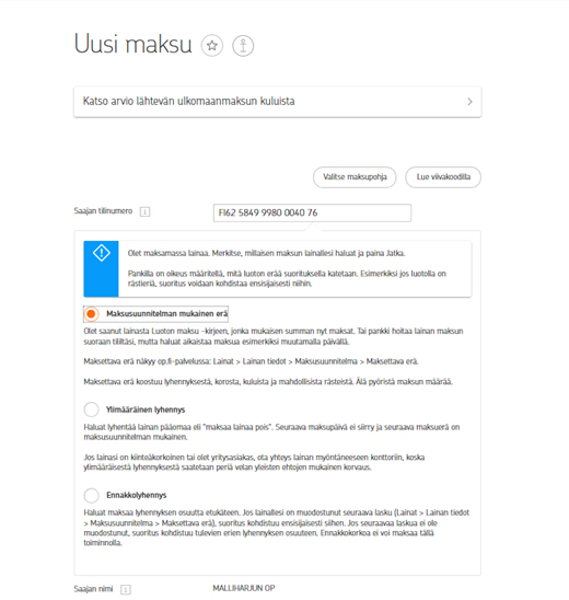 Käytä Uusi maksu -toimintoa ja laita saajaksi lainan numero.