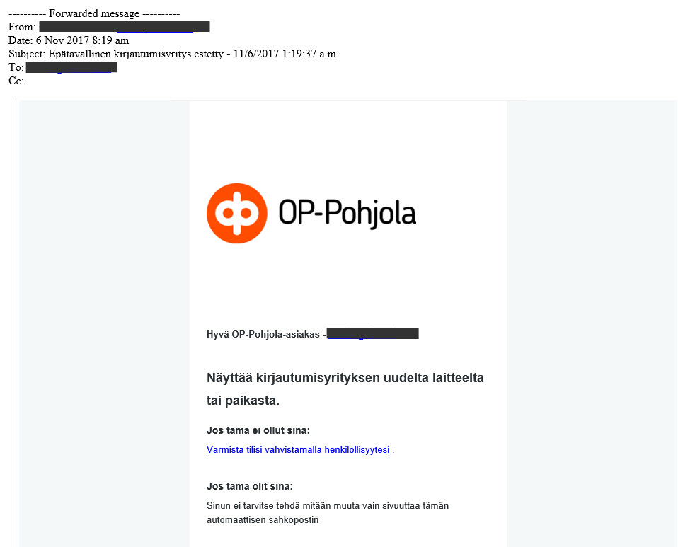 OPn asiakkaiden tunnuksia kalastellaan kahdella eri tyyppisellä huijaussähköpostilla. Ensimmäisessä kerrotaan että ”verkkotilin salainen koodi” on syötetty väärin ja pyydetään tekemään käyttöoikeuksien palautus linkin kautta. Toinen sähköposti kertoo kirjautumisyrityksestä uudelta laitteelta tai paikasta ja pyytää vahvistamaan henkilöllisyyden klikkaamalla linkkiä.