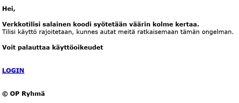 The messages may say that the customer would have entered the online bank’s password incorrectly and request the customer to restore the user rights by clicking on the link. The link in the message may direct you to a phishing website that resembles OP eServices. The fraudster requests you to give, for example, your eServices user identifiers and your password.