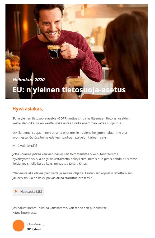 The messages may refer to the EU General Data Protection Regulation and ask you to update your information. The link in the message may direct you to a phishing website that resembles OP eServices. The fraudster requests you to give, for example, your eServices user identifiers and your password.