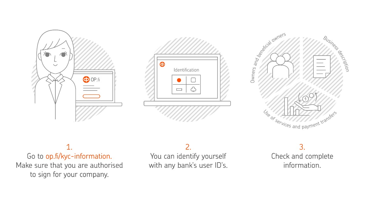 Your company's information can be updated at op.fi/kyc-information. The information can be entered by a person with the right to represent your company, such as the right to sign for the company. You can log into the service with OP's or another bank's user ID.