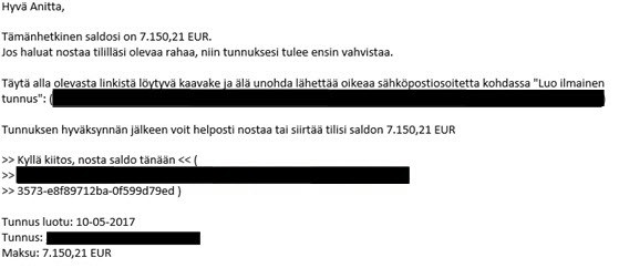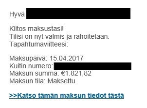 Also OP’s customers have received phishing emails, which indicate that the receiver has made a payment or that ”tiliä rahoitetaan” (“the account is financed”). The messages concern binary options and we recommend that you do not follow the message instructions. The approach of the messages is suspicious.