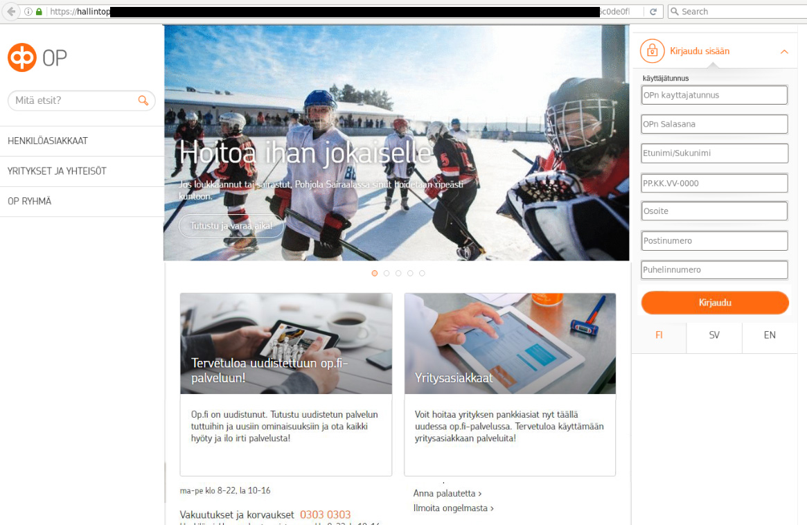 If you have already entered your online user identifiers on the phishing page, deactivate them immediately by calling 0100 0500 (weekdays from 8.00 am to 10.00 pm, Saturdays 10.00 am to 4.00 pm, local network charge/mobile charge). Outside the telephone service hours, deactivate your user identifiers by calling the Deactivation Service, tel. +358 20 333 (24/7). Also report the incident to OP telephone service when it is open again.