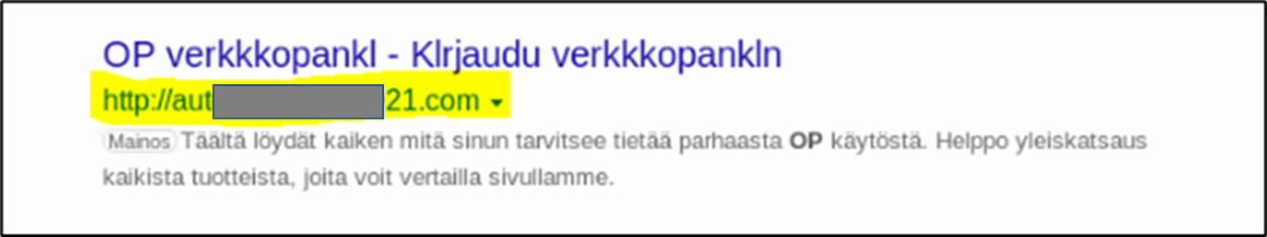Criminals have succeeded in getting scam websites mimicking the op.fi service to appear among the top search results for the purpose of phishing online bank user identifiers. User IDs and passwords entered into a scam website end up in the criminals’ possession and are used to attempt unauthorised payments.