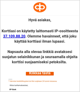 Cybercriminals send phishing messages again in our name. In particular, a message saying that your card has been used illegally and without your permission is spreading at the moment. The message is in Finnish.