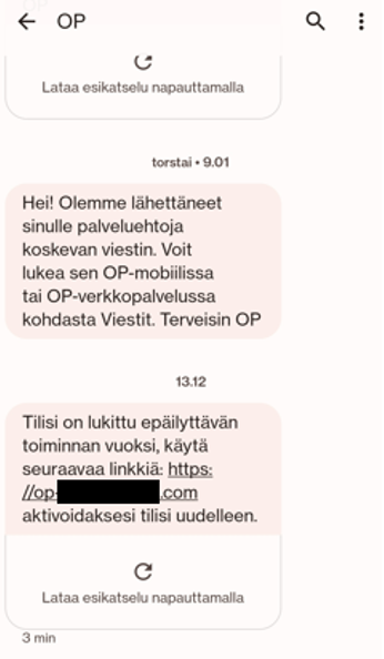 Cybercriminals are sending SMSes in OP's name claiming that the customer's online use has been locked due to suspicious activity. In the scam messages, the customer is asked to reactivate banking access by clicking on the link sent in the message. The link will direct you to a website that appears like the op.fi service for the purpose of phishing for your online bank user identifiers and payment card details.