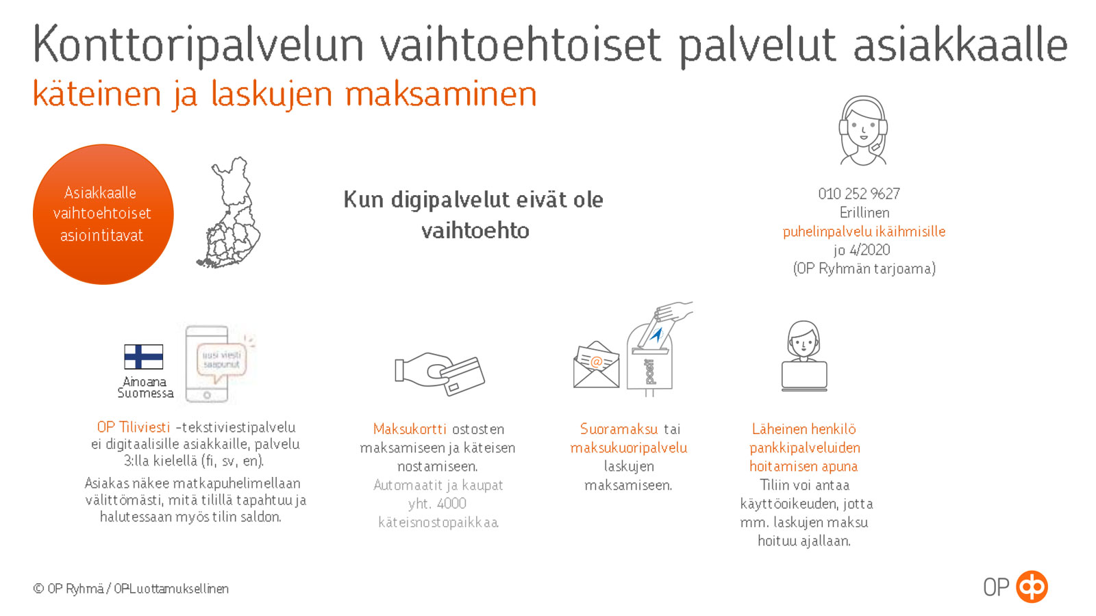 Laskujen maksaminen hoituu jatkossakin helpoiten suoramaksuna, e-laskuna tai OP-mobiilipalvelun kautta. Lisäksi maksukuoripalvelulla voi hoitaa laskujen maksamisen, mikäli digipalvelut eivät ole vaihtoehto. Päivittäiset ostokset voi maksaa kätevimmin pankki- ja luottokorteilla.