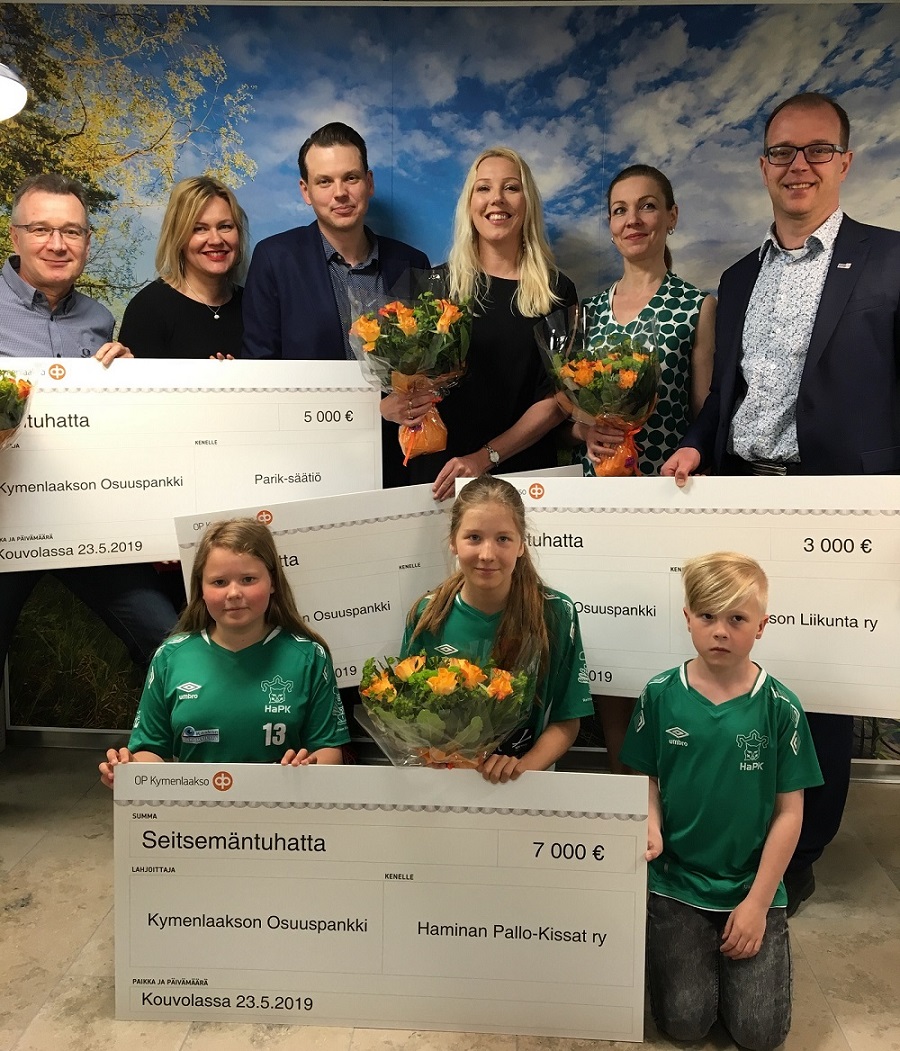 Kuvassa ylärivissä vasemmalta: Risto Uotila, Sirpa Lundberg ja Pasi Hedman Parik-säätiöstä, Christa Carpelan MLL:n Kymen piiristä, Heli Vaija Ehyt ry:stä ja Tommi Lehtinen Kymenlaakson Liikunta ry:stä. Alarivissä vasemmalta: Alisa Koistinen, Tuuli Kriktilä ja Sampo Vierikko Haminan Pallo-Kissat ry:stä.