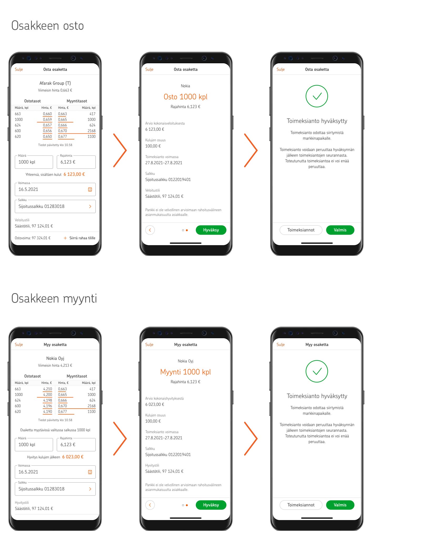 Uudistimme osakkeiden osto- ja myyntinäkymät. Jos uudistus ei vielä näy sinulla, varmista, että käytössäsi on viimeisin versio OP-mobiilista. Voit päivittää sovelluksen uusimpaan versioon App storessa tai Google Playssa.