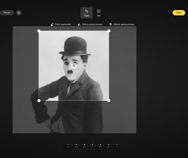 Kuvan rajaaminen tapahtuu kuvan nurkista olevista valkoisista ympyröistä. Tarvittaessa kuvaa voi myös kääntää tai kiertää kuvan yläpuolelta olevista valintapainikkeista. Kuvan muokkaamisen jälkeen valitaan valmis.