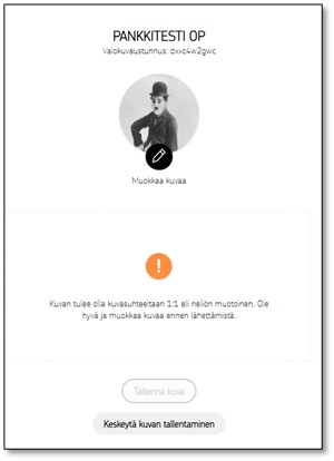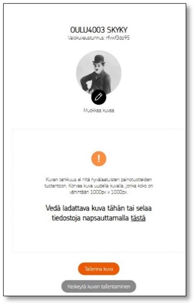 Kuvan hakemisen jälkeen kuvaa voi muokata sovelluksen muokkausominaisuuksilla. Jos kuva ei täytä teknisiä vaatimuksia, järjestelmä ei salli kuvan tallentamista. Tällöin ruudulla näkyy oranssi huutomerkki.