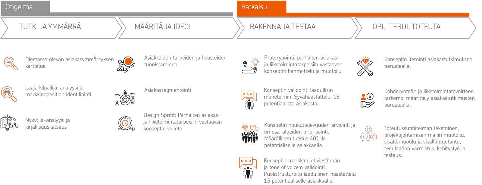 Lähdimme ratkaisemaan ongelmaa muotoiluprosessin avulla. Kahlasimme läpi lukuisia asiakastutkimuksia sekä osallistimme asiakkaita syvähaastattelun ja kyselytutkimuksen keinoin. Löysimme paljon sijoittamisen kipupisteitä. Jo ensimmäiset löydökset kirjallisuuskartoituksesta olivat pysäyttäviä. Vasta-alkajan mielikuvissa sijoittaminen oli vaikeaa, ja hän koki hukkuvansa tietotulvaan. Jo aiemmin sijoittanut henkilö tunsi itsensä epävarmaksi ja koki termit vaikeiksi.