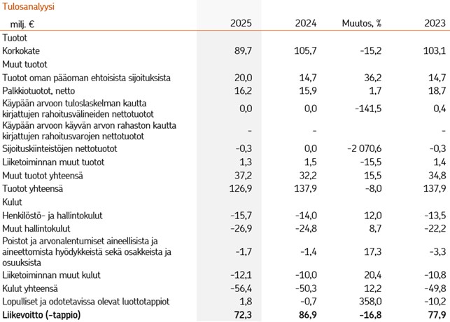 Varsinais-Suomen Osuuspankin asema vahvistui edelleen alueellisesti merkittävänä ja vakavaraisena pankkina vuoden 2025 aikana. Korkokate supistui 89,7 miljoonaan euroon (105,7) ja pankin liikevoitto heikkeni 16,8 prosenttia vuoden takaisesta vertailuajankohdasta ollen 72,3 miljoonaa euroa (86,9). Pankin nettopalkkiotuotot kasvoivat 1,7 prosenttia edelliseen vuoteen verrattuna.