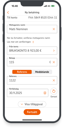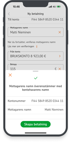 Kontobetalningarna förnyas. Mottagaren du anger för betalningar kommer att verifieras fr.o.m. 9.10. Det gör dina betalningar tryggare.Verifiering av mottagarens namn ökar säkerheten