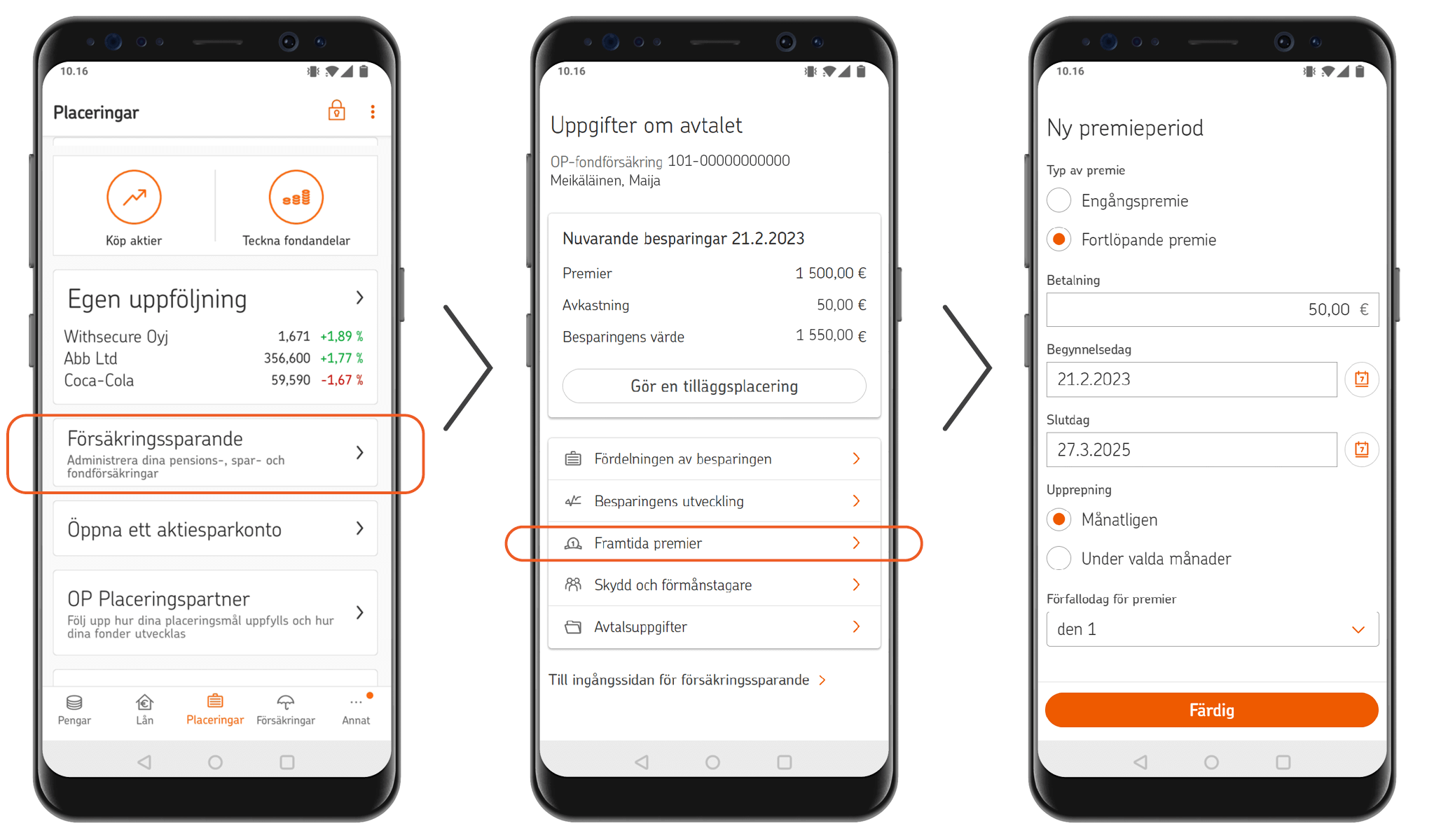 Genom att följa utvecklingen av dina besparingar hålls du uppdaterad och kan göra ändringar om du vill. I vår digitala tjänst kan du vid behov sprida eller byta placeringsobjekt till exempel enligt geografiskt läge. Det går också smidigt att göra tilläggsplaceringar, ända betalningsplanen eller byta förmånstagare. Ändringarna du gör i vår digitala tjänst är kostnadsfria för dig. Gör din vardag lättare med vår digitala tjänst. Du kan sköta dina ärenden i den digitala tjänsten med en mobilapplikation eller webbläsare.