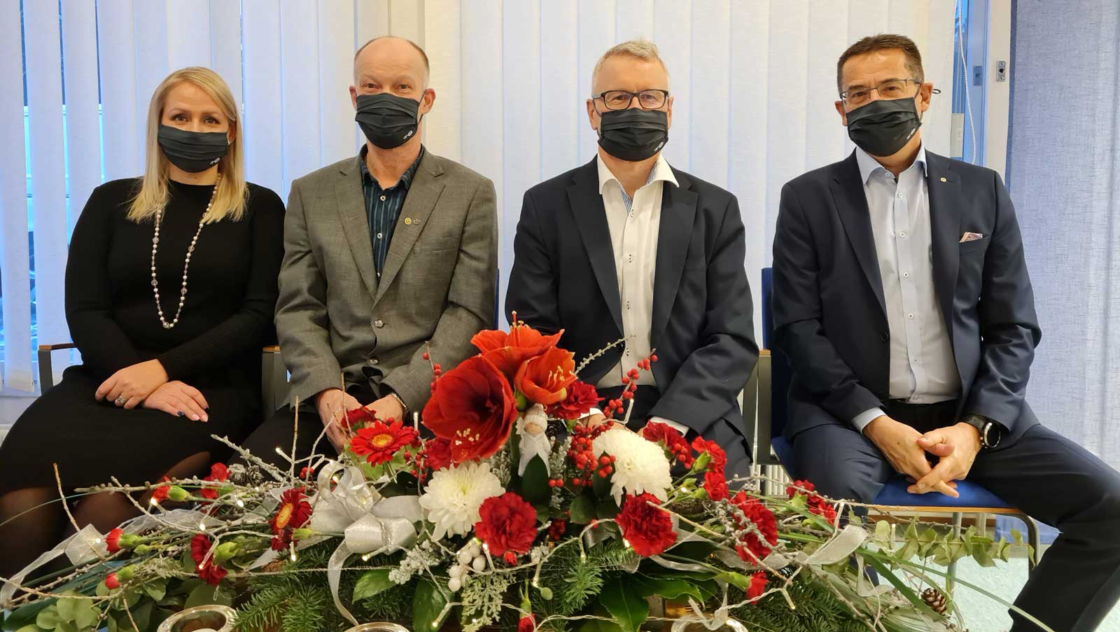 Kuvassa vasemmalta oikealle: Kiikoisten Osuuspankin toimitusjohtaja Minna Uusitalo ja hallituksen puheenjohtaja Arto Mäkelä. Länsi-Suomen Osuuspankin hallituksen puheenjohtaja Jarmo Tanhua ja toimitusjohtaja Matti Kiuru.