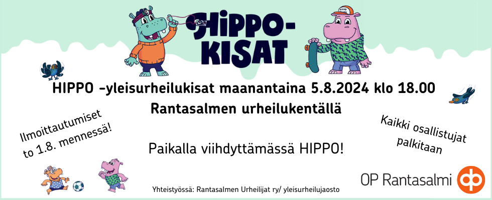 Rantasalmen Osuuspankki järjestää perinteiset HIPPO-yleisurheilukisat yhdettätoista kertaa! Tule siis kisailemaan ma 5.8.2024 klo 18.00 Rantasalmen urheilukentälle!