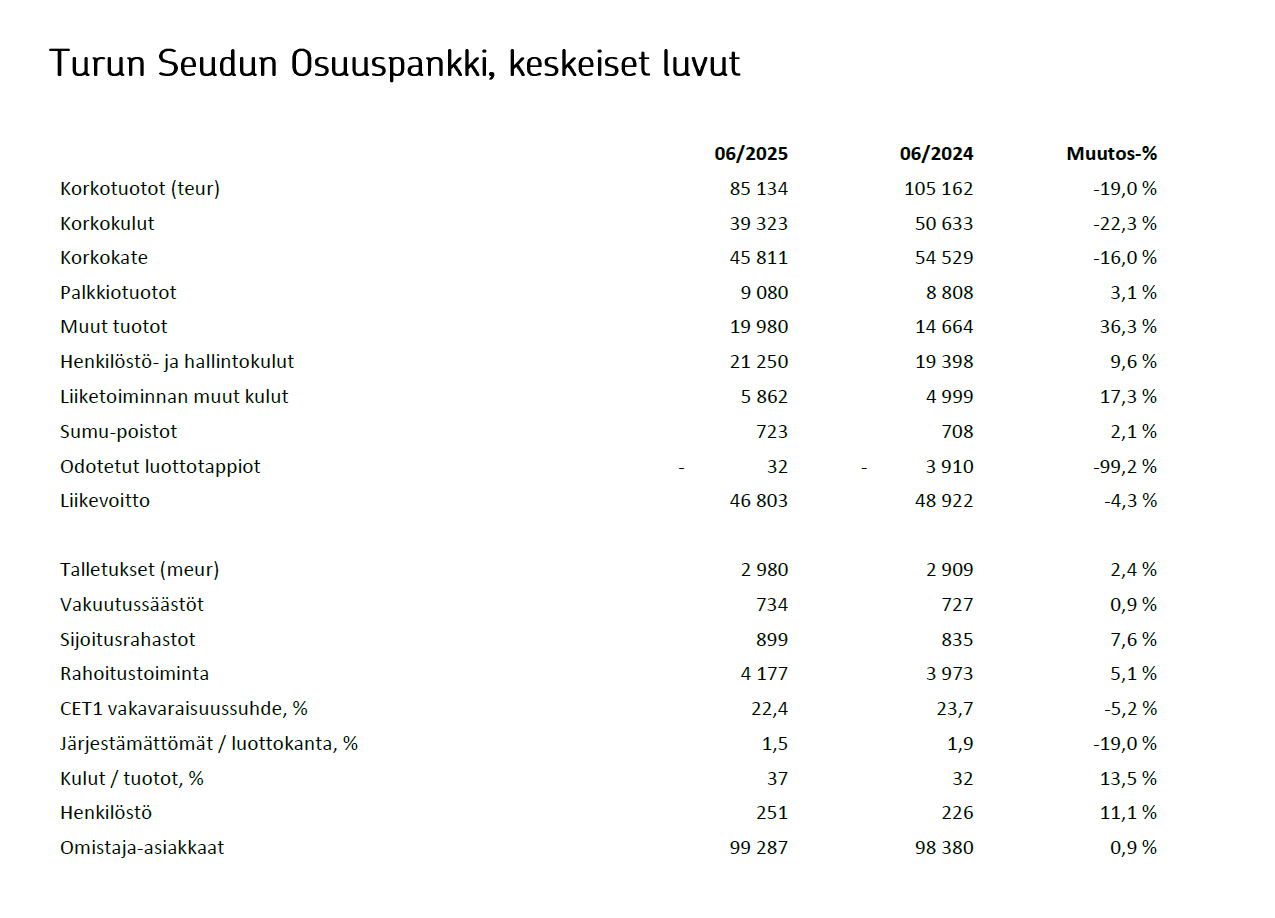 Pankin liikevoitto supistui alkuvuonna noin 4 prosenttia vuoden takaiseen vertailukohtaan (46,8 milj. € vs. 48,9 milj. €). Liikevoiton kehitykseen vaikutti erityisesti korkokatteen supistuminen (-16 %) markkinakorkojen laskujen myötä. Palkkiotuotot kasvoivat 3 prosenttia vuoden takaisesta. Lisäksi muut tuotot kasvoivat voimakkaasti OP Ryhmän sisäisten osinkotulojen myötä. Kulut kasvoivat yhteensä 11 prosenttia. ”Sääntelyn, asiakkaiden toiveiden ja kasvavien volyymien edellyttämän pankkitoiminnan harjoittaminen vaatii koko ajan enemmän resursseja. Edellä mainituista syistä olemme lisänneet henkilökuntamme määrää. Kokonaisuutena vuosi 2025 on sujunut varsin hyvin ja suunnitelmia paremmin. Tuloksellisesti ja uusmyynnin näkökulmasta odotamme koko tilikaudesta varsin hyvää ja näemme asuntokaupan ja talouden hiljalleen piristyvän”, Rinne summaa.